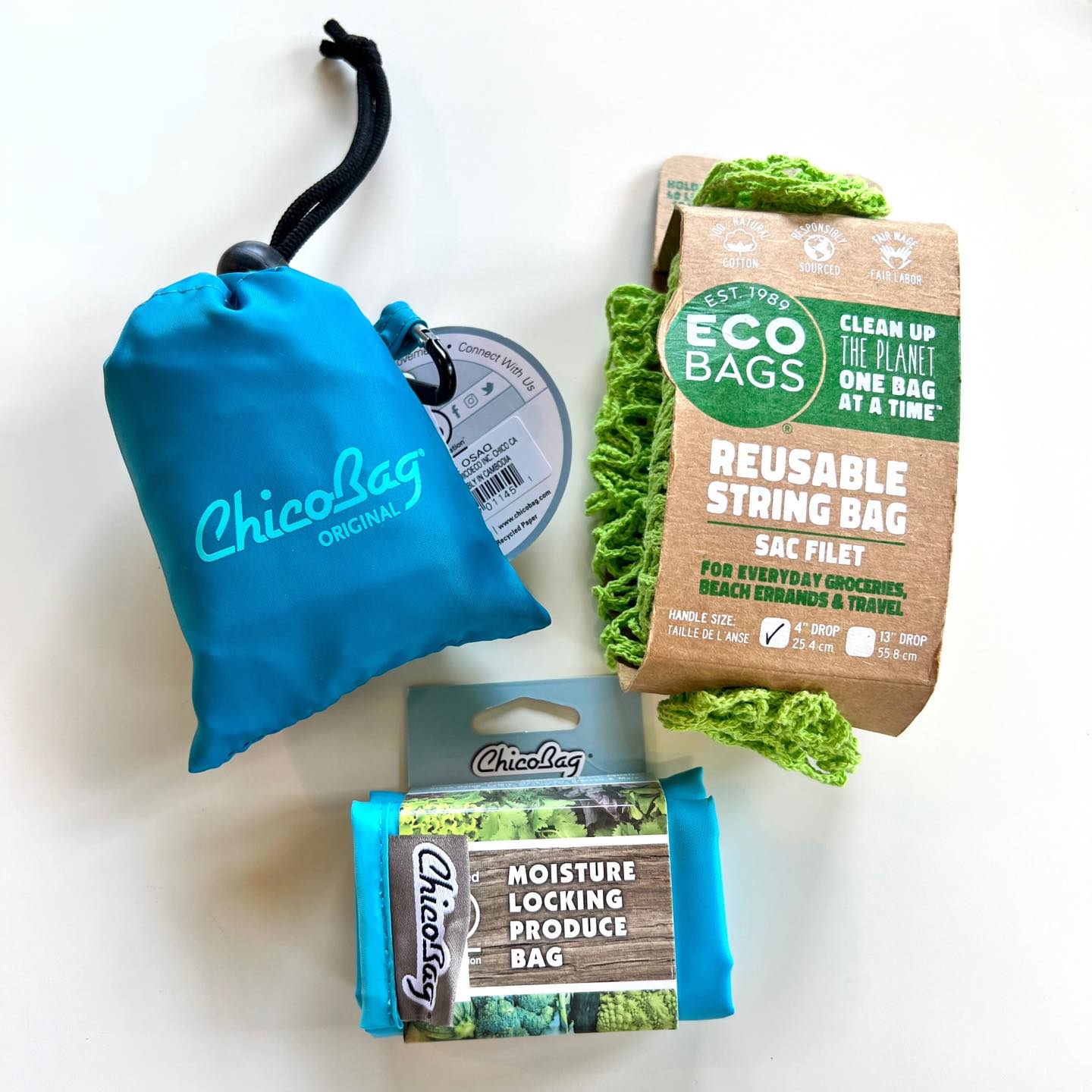 Reusable bags help us to reduce our single use plastic. Shown here are bags from Chicobag and Eco Bags.